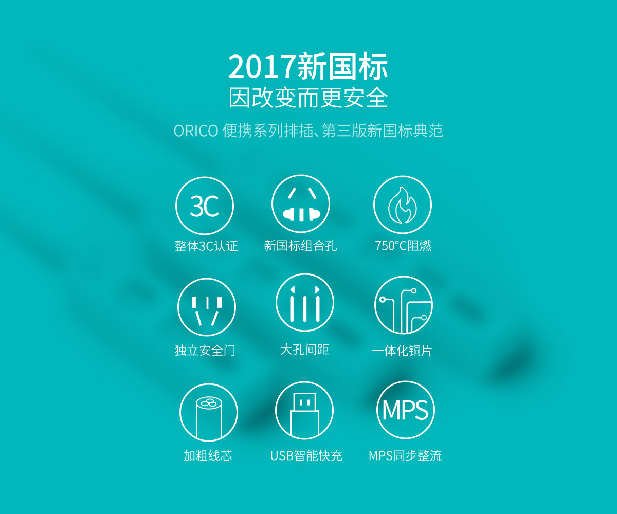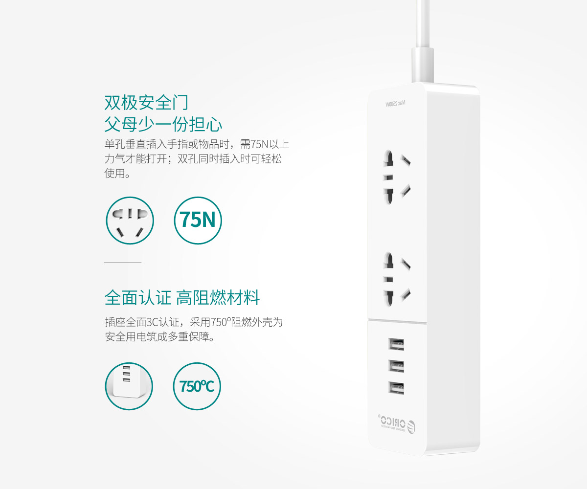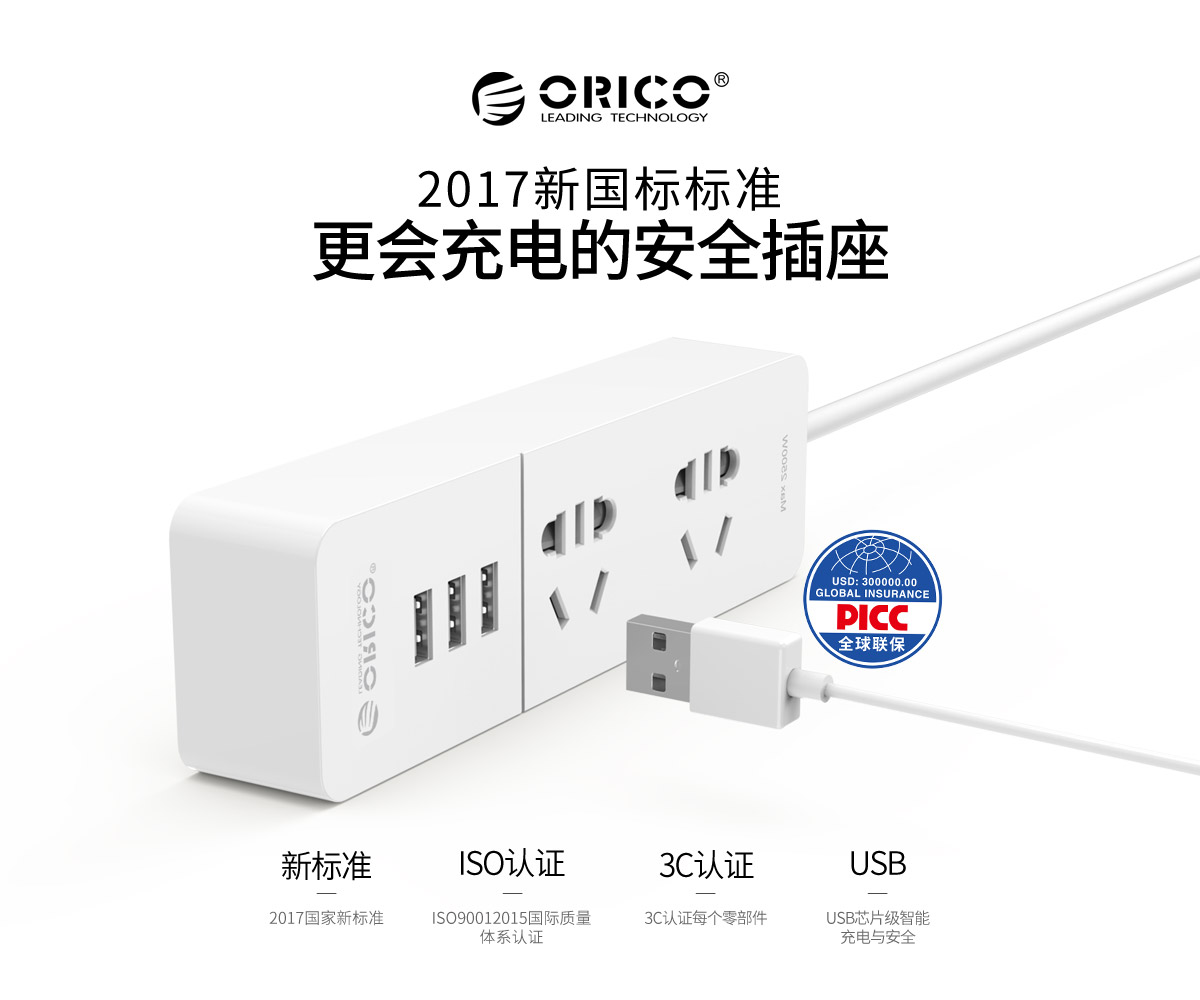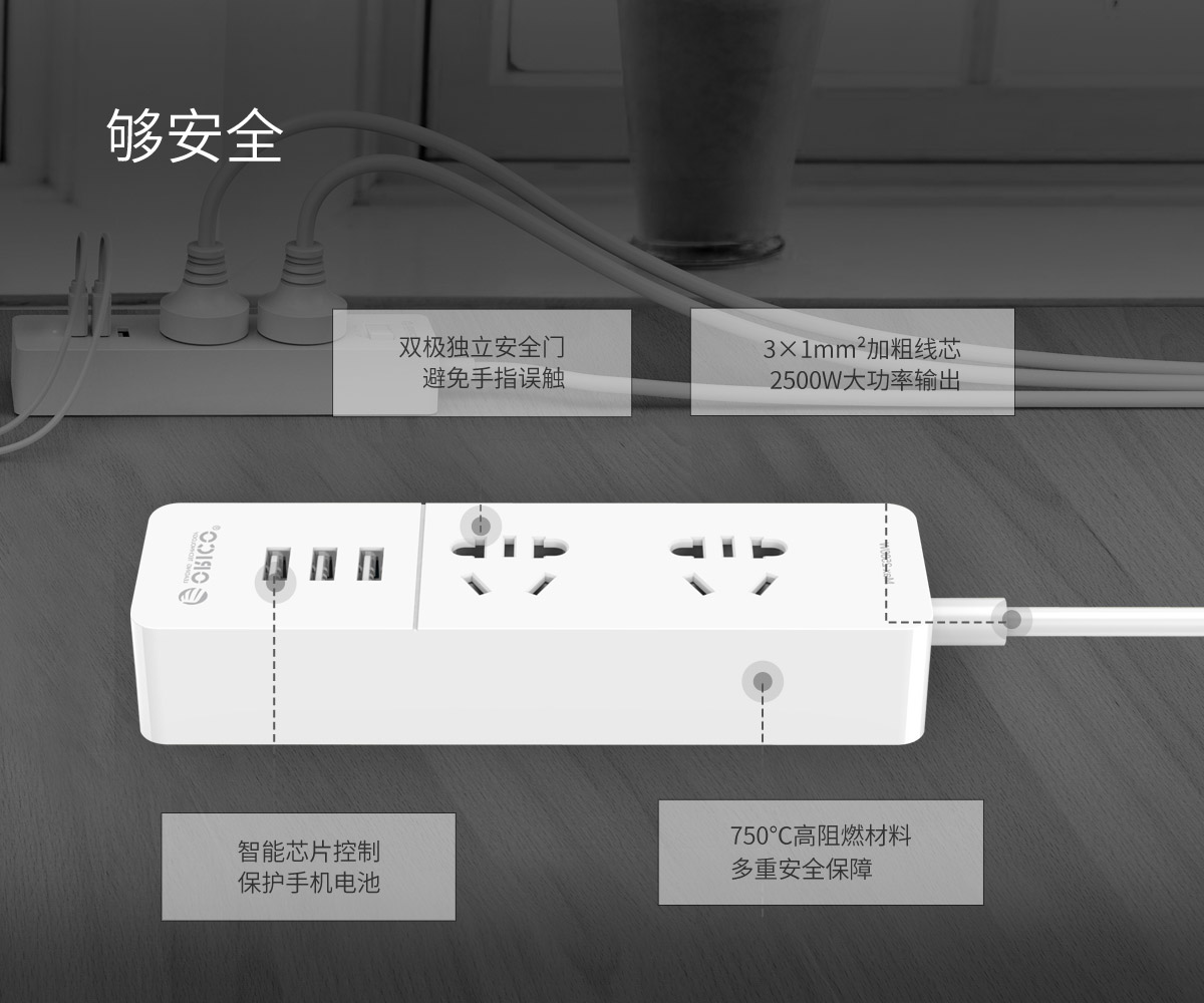 新國標便攜桌面式排插,雙極門獨立開關,2500W大功率
