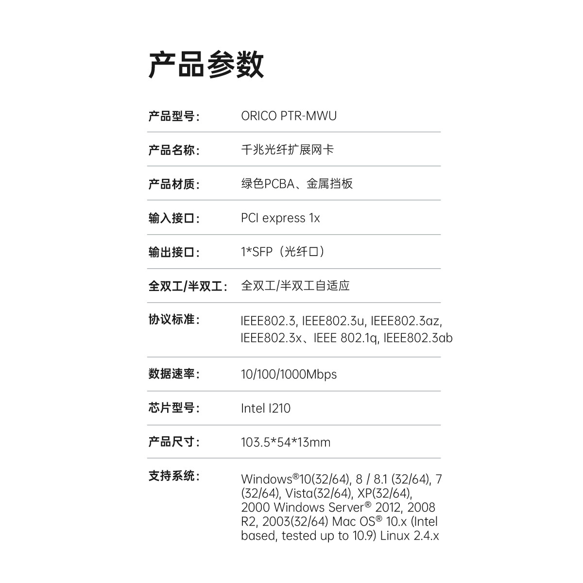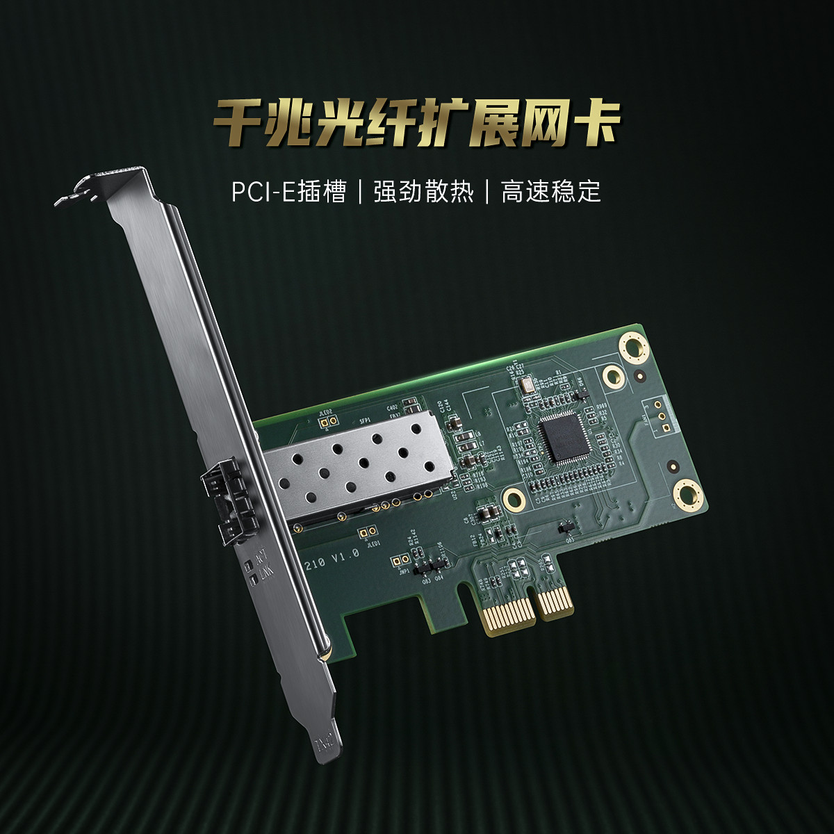 PCl-E插槽│強勁散熱|高速穩定,配備一個標準的SFP光纖口,可插入千兆光纖模塊,采用Intel 1210芯片,更大程度上消除干擾