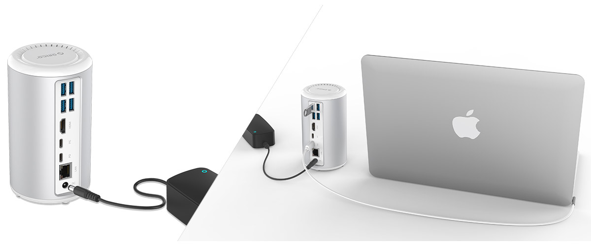 1、搭配臺式機/普通不支持PD的筆記本等設備,直接使用DC 12V接口即可使用; 2、搭配支持PD功能的筆記本,可使用筆記本原裝充電器,或是支持Type-C PD功能的充電器通過數據線連接支架中的Type-C PD接口,給筆記本進行反向供電。