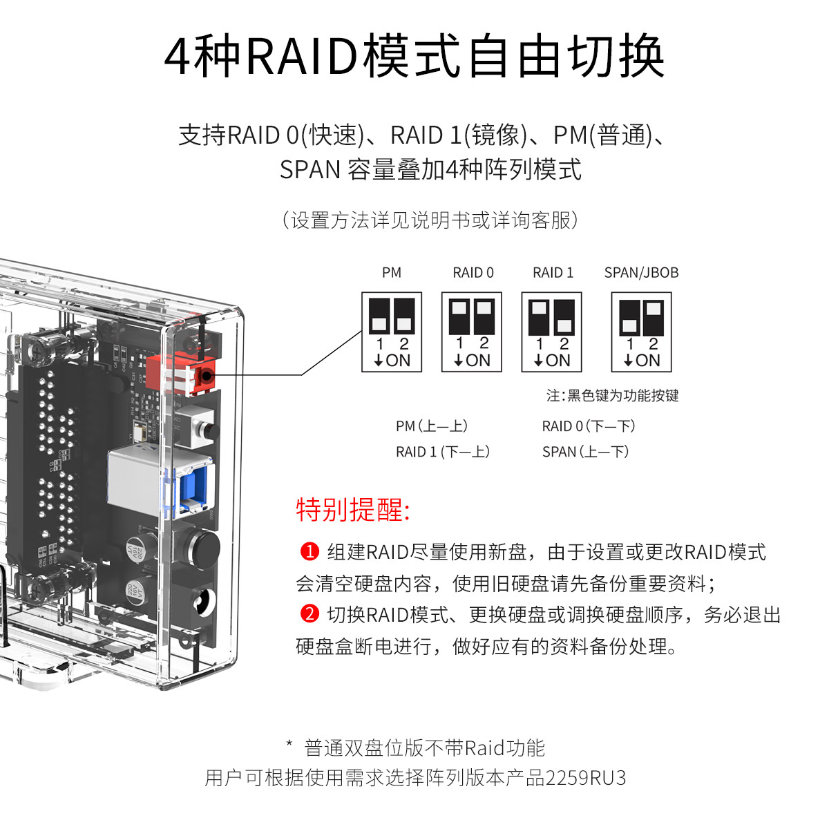 雙盤位磁盤陣列外置擴(kuò)容,1秒換盤,雙盤4TB同時(shí)讀寫,4種模式自動(dòng)切換,智能休眠
