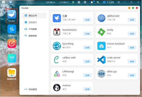點擊首頁的“Docker”,進到Docker應用界面。 在“精選應用”可以看到一些設置好默認參數了的Docker容器,只需點擊安裝即可使用。